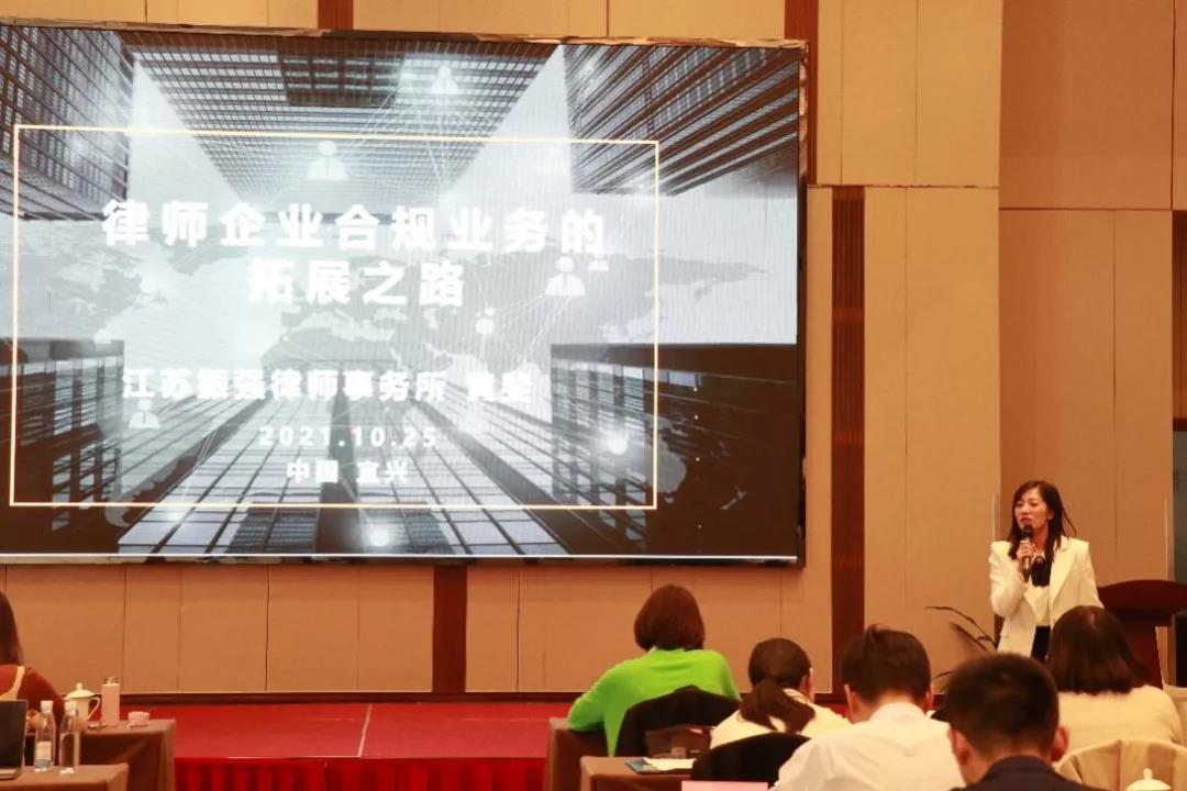 紧接着,市律师协会青年律师工作委员会副主任黄斐为学员们带来了《律师企业合规业务的拓展之路》专题讲座。她从合规业务的需求发现、合规业务的拓展方式、专项合规计划的打造这三个方面,结合一个个生动的案例,向学员们展示了如何从刑事、行政和国际制裁的角度让企业认识到合规业务的重要性。