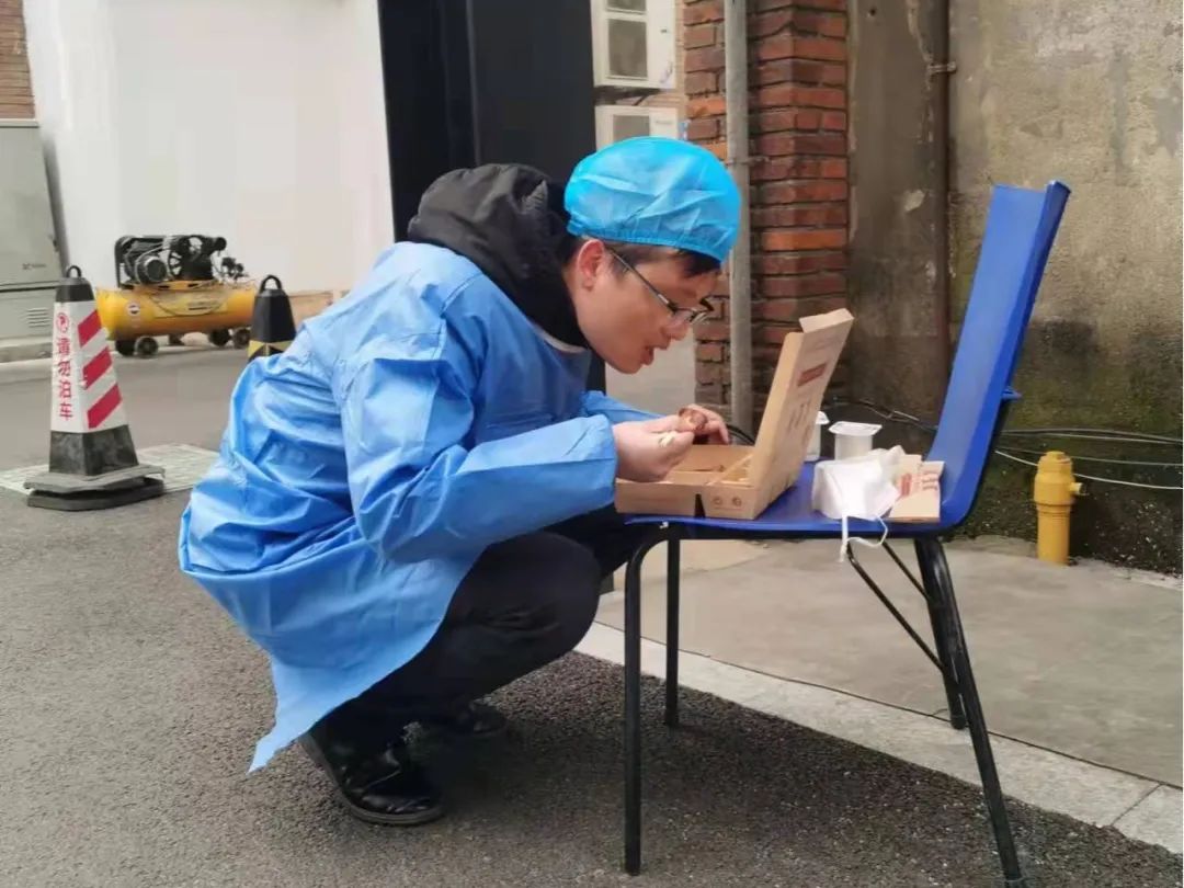 2月22日凌晨6点,我赶赴清明桥伯渎港社区创意园点位,换好防护服后,便开始测温、查验行程码、健康码等核酸检测辅助工作,临近中午也只是在椅子上扒两口饭又继续工作,一上午查出有外地风险地区行程8人,把可能的感染源挡在门外;下午,在扬名清一社区塘泾里点位,测温、查验健康码几百人,一直到晚6点才结束。结束塘泾里点位上的工作后,我又回到伯渎港社区创意园点位,一直工作到晚上8点才结束。