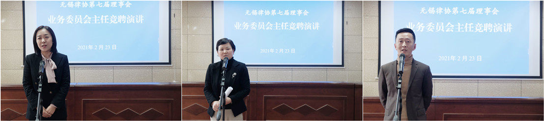为进一步优化市律协业务委员会人员组成,充分发挥业务委员会的职能作用,2月23日下午,无锡市律师协会举行了第七届理事会部分业务委员会主任公开竞聘演讲活动,共有41名律师分别竞聘刑事辩护业务委员会等12个业务委员会的主任职位。